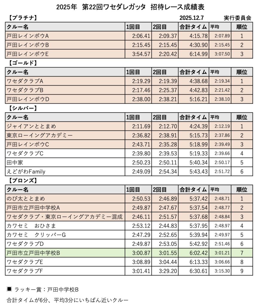 New 第22回ワセダレガッッタ招待レース成績表(2025年12月7日実施)